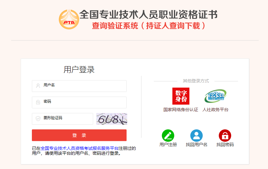 已在中國人事考試網(wǎng)“全國專業(yè)技術(shù)人員資格考試報名服務(wù)平臺”注冊過的持證人員,請直接使用該平臺的用戶名、密碼進行登錄。