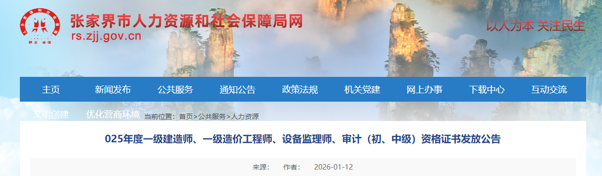 湖南省張家界2025年一級(jí)造價(jià)工程師資格證書發(fā)放公告