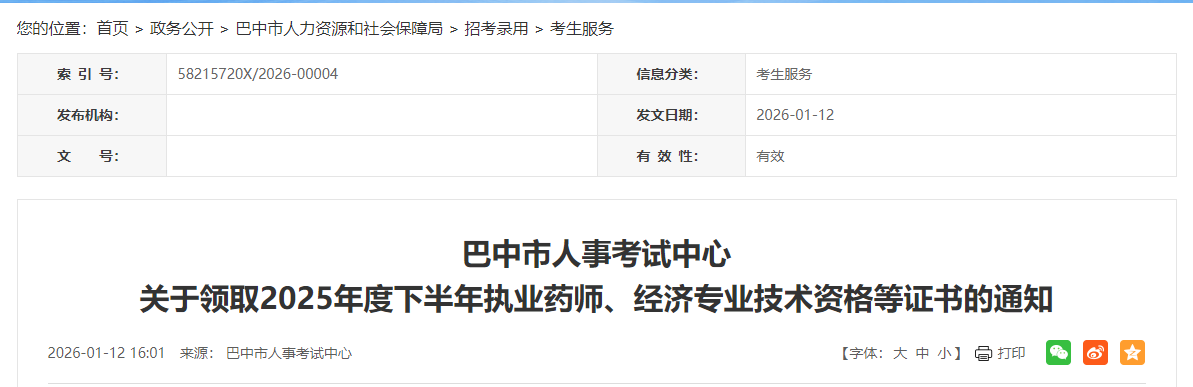 2025年度下半年執(zhí)業(yè)藥師、經(jīng)濟(jì)專業(yè)技術(shù)資格、計(jì)算機(jī)技術(shù)與軟件專業(yè)技術(shù)資格、審計(jì)專業(yè)技術(shù)資格、一級(jí)建造師、一級(jí)造價(jià)工程師證書(shū)已到巴中,考生可通過(guò)以下方式前來(lái)領(lǐng)取。