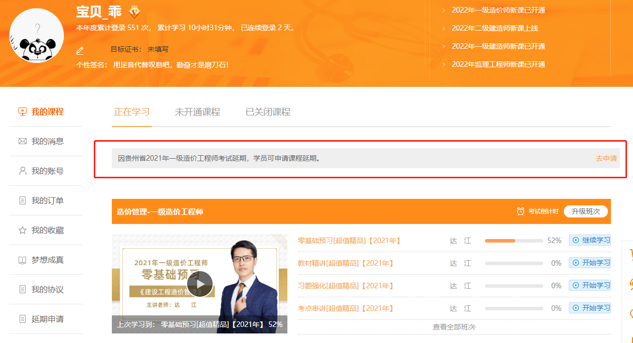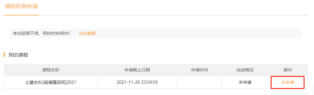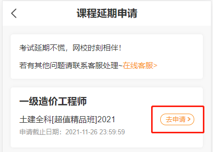 之前已經報名網校2021年一級造價師考試課程的同學不用擔心可以申請延期課程了,入口在“我的網校我的家”,請大家及時申請,不要錯過。