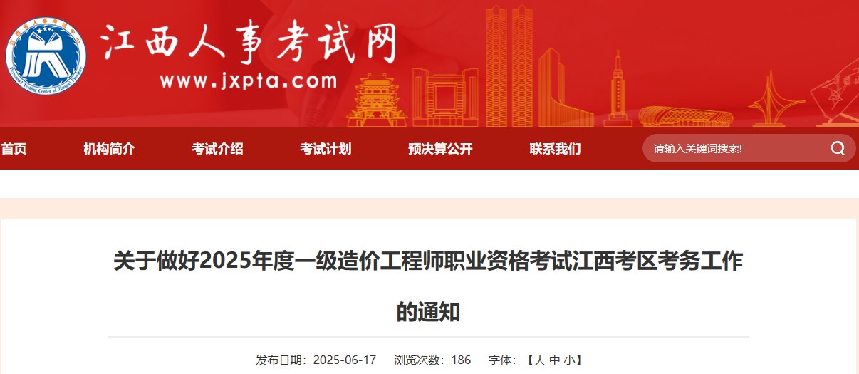 根據(jù)《人力資源社會(huì)保障部辦公廳關(guān)于2025年度專業(yè)技術(shù)人員職業(yè)資格考試計(jì)劃及有關(guān)事項(xiàng)的通知》(人社廳發(fā)〔2025〕1號(hào))以及《人力資源社會(huì)保障部人事考試中心關(guān)于2025年度一級(jí)造價(jià)工程師職業(yè)資格考試考務(wù)工作的通知》(人考中心函〔2025〕22號(hào))精神,為做好2025年度一級(jí)造價(jià)工程師職業(yè)資格考試江西考區(qū)考務(wù)工作,現(xiàn)將有關(guān)事項(xiàng)通知如下:
