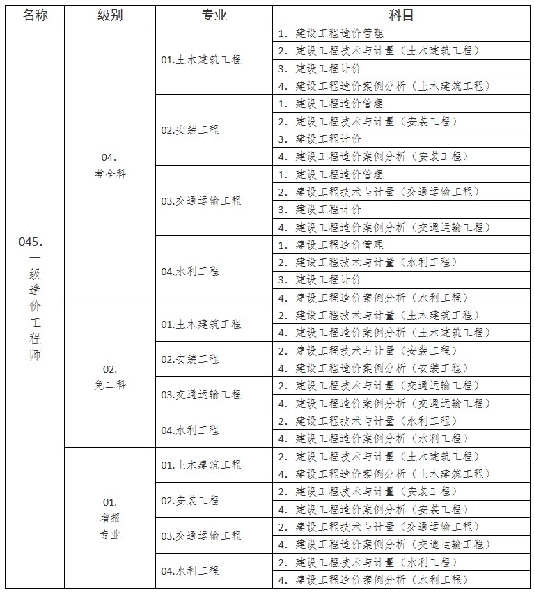 一級(jí)造價(jià)工程師職業(yè)資格考試代碼及名稱表