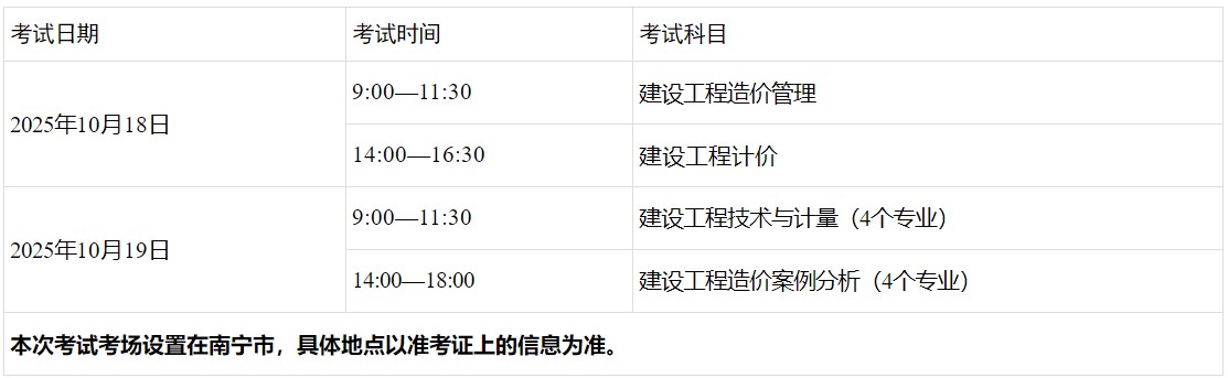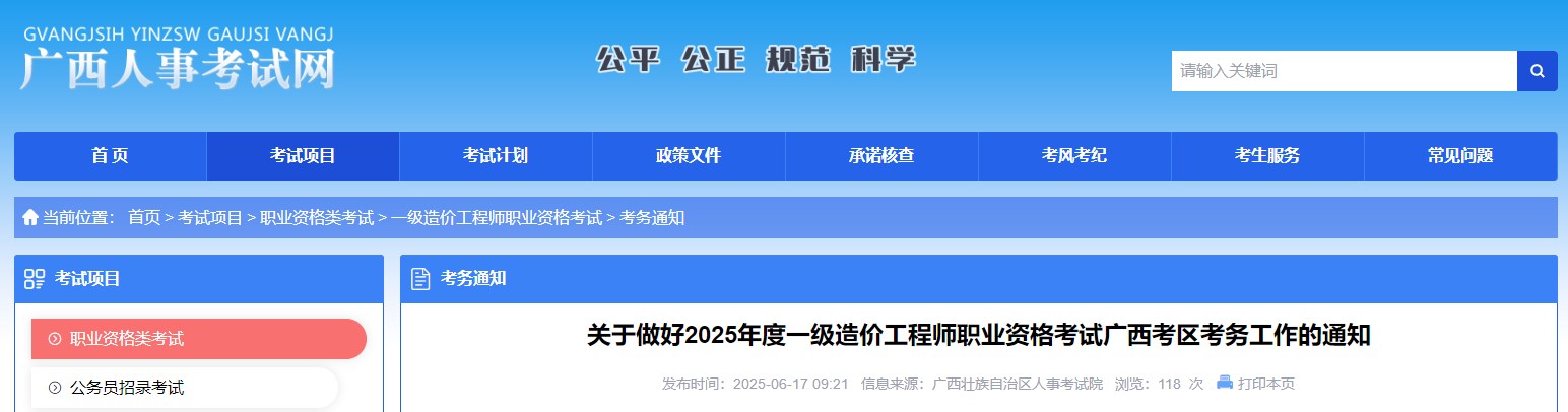 根據(jù)《人力資源和社會保障部人事考試中心關(guān)于2025年度一級造價工程師職業(yè)資格考試考務工作的通知》(人考中心函〔2025〕22號)精神,為做好2025年度一級造價工程師職業(yè)資格考試廣西考區(qū)考務工作,現(xiàn)將有關(guān)事項通知如下: