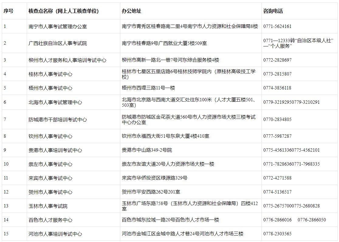 全區(qū)人事考試組織機構(gòu)(核查點)地址及聯(lián)系方式如下: