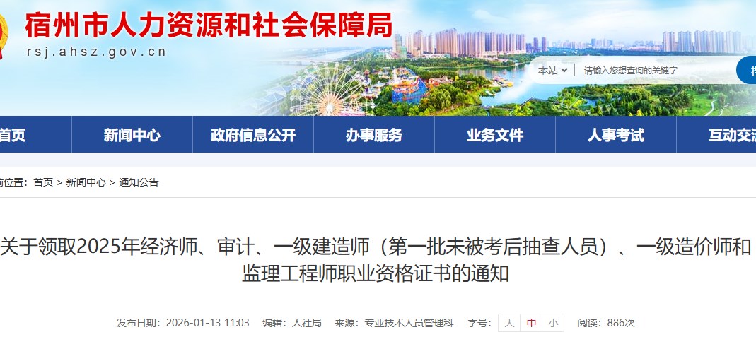 安徽省宿州市2025年度一級(jí)造價(jià)工程師資格證書(shū)領(lǐng)取通知