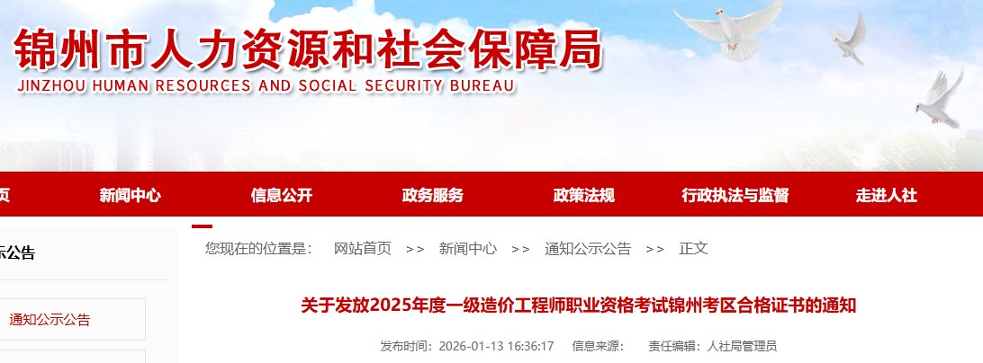 錦州市人事考試服務(wù)中心定于2026年1月21日開始發(fā)放2025年度一級造價(jià)工程師資格考試合格證書。