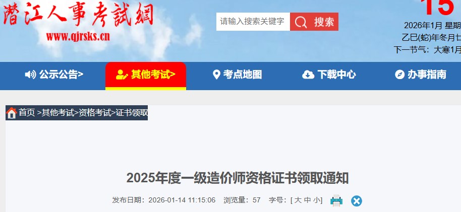 湖北省潛江市2025年度一級(jí)造價(jià)工程師資格證書(shū)領(lǐng)取通知