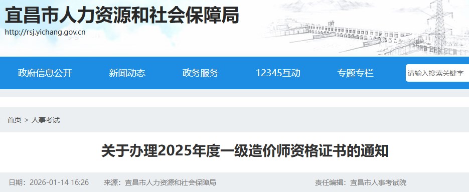 湖北省宜昌市2025年度一級(jí)造價(jià)工程師資格證書領(lǐng)取通知