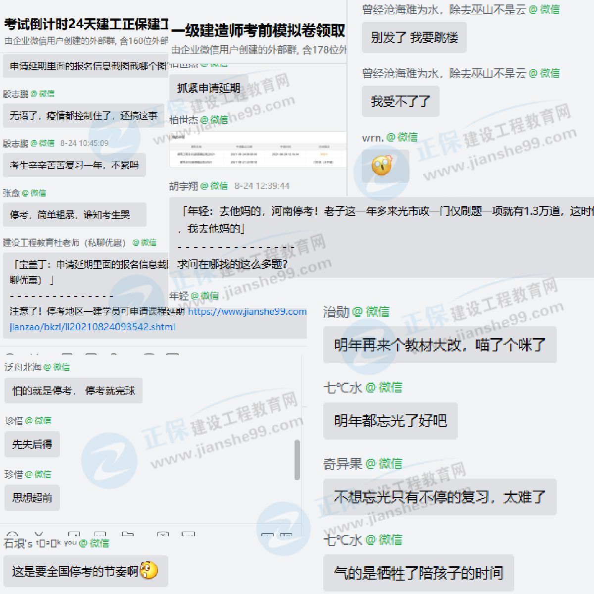 今日,江蘇、河南、陜西發(fā)布了2021年一級建造師??纪ㄖ忌鷤冏蛔×?,在群里紛紛議論起來,有的童鞋說:備考了這么久,這個(gè)時(shí)候說不考了,要跳樓的心都有了!有的學(xué)員說:光市政就做了1.3萬題目,現(xiàn)在說??剂耍∵€有的學(xué)員說:辛辛苦苦復(fù)習(xí)一年,誰知學(xué)員苦?……