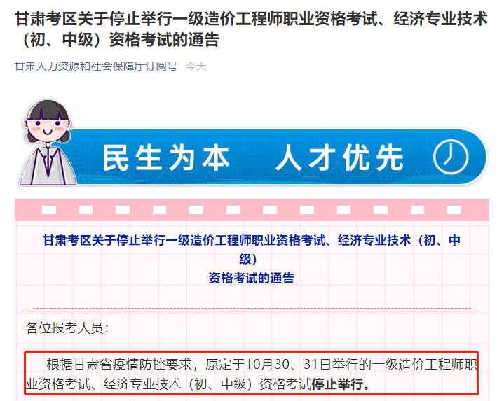 根據(jù)甘肅省疫情防控要求,原定于10月30、31日舉行的一級造價工程師職業(yè)資格考試、經(jīng)濟專業(yè)技術(shù)(初、中級)資格考試停止舉行。
