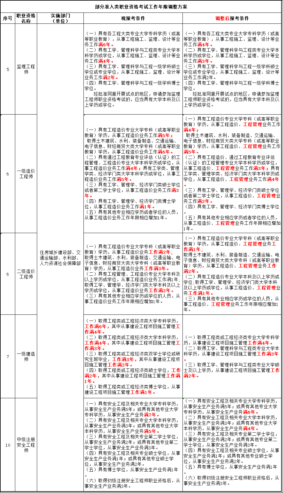 人力資源和社會(huì)保證部于12月3日發(fā)布《關(guān)于部分準(zhǔn)入類職業(yè)資格考試工作年限調(diào)整方案公示》,涉及:一級(jí)造價(jià)工程師、二級(jí)造價(jià)工程師、監(jiān)理工程師、一級(jí)建造師、中級(jí)注冊(cè)安全工程師,工作年限要求降低!放低報(bào)考門檻!是不是說(shuō)明需要的專業(yè)人才更多?市場(chǎng)需求量大?供不應(yīng)求?原本不符合條件的你,現(xiàn)在可以報(bào)考了?不用再等明年或后年?。?!抓住這次機(jī)會(huì),證書離你更近一步!