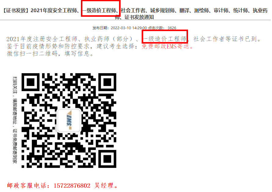 江蘇徐州2021年度一級(jí)造價(jià)工程師證書(shū)發(fā)放通知