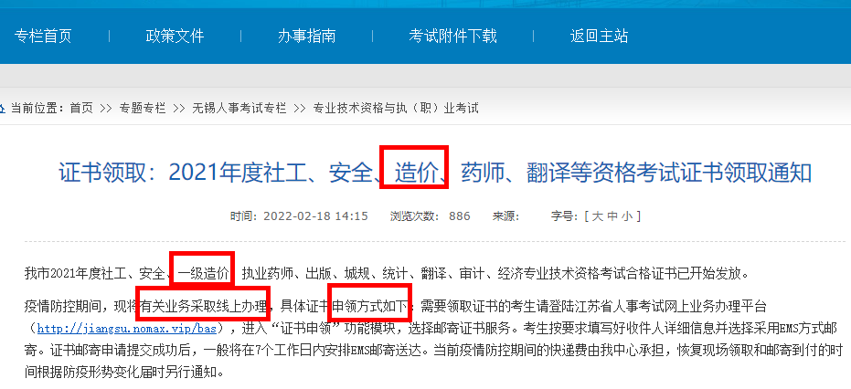 江蘇無錫2021年度一級造價工程師資格考試證書領(lǐng)取通知