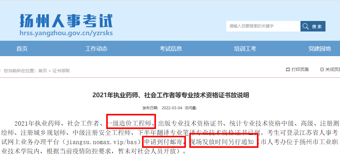 2021年執(zhí)業(yè)藥師、社會工作者、一級造價工程師、出版專業(yè)技術(shù)資格證書、統(tǒng)計專業(yè)技術(shù)資格中級、高級、注冊測繪師、注冊城鄉(xiāng)規(guī)劃師、中級注冊安全工程師、下半年翻譯專業(yè)筆譯專業(yè)技術(shù)資格證書已到??忌傻卿浗K省人事考試網(wǎng)上業(yè)務(wù)辦理平臺(jiangsu.nomax.vip/bas)申請到付郵寄,現(xiàn)場發(fā)放時間另行通知(市人考辦位于揚州市工業(yè)職業(yè)技術(shù)學(xué)院內(nèi),根據(jù)當(dāng)前疫情防控要求,暫未對社會人員開放)。