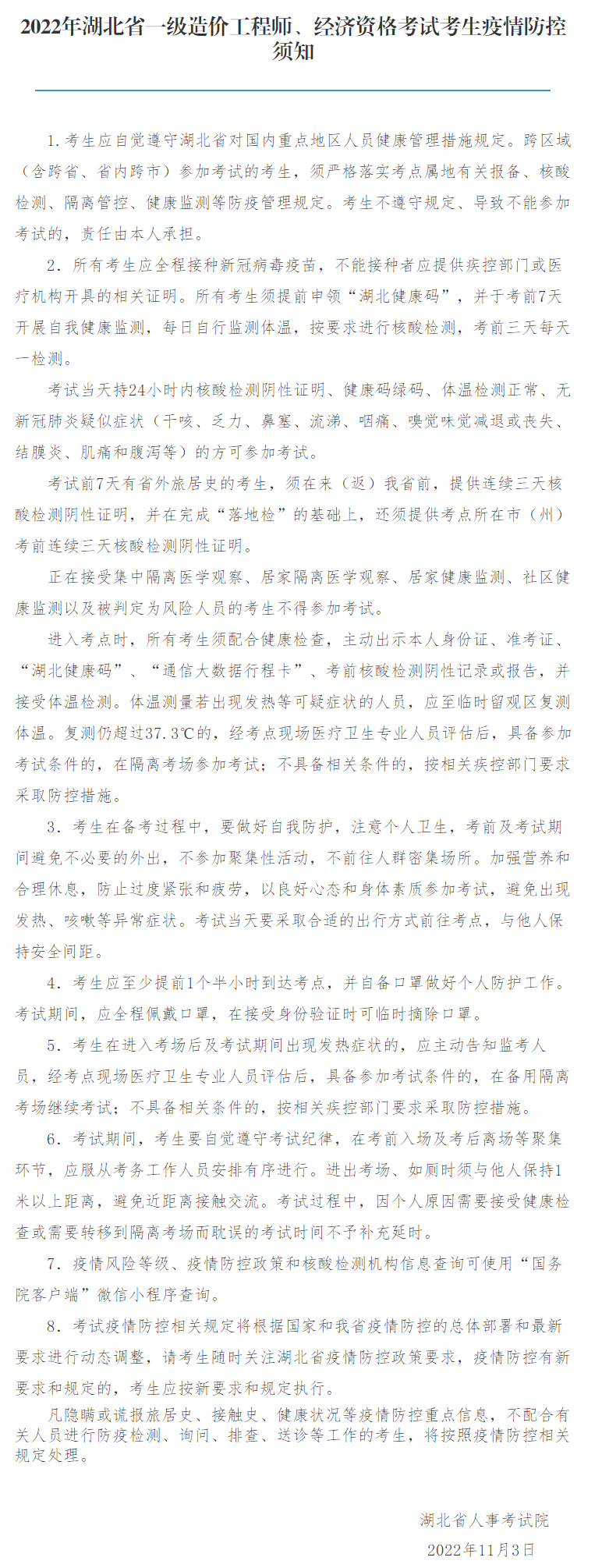 湖北省人事考試網(wǎng)發(fā)布《2022湖北省一級造價工程師、經(jīng)濟資格考試考生疫情防控須知》,其中涉及一級造價師考試,詳情如下: