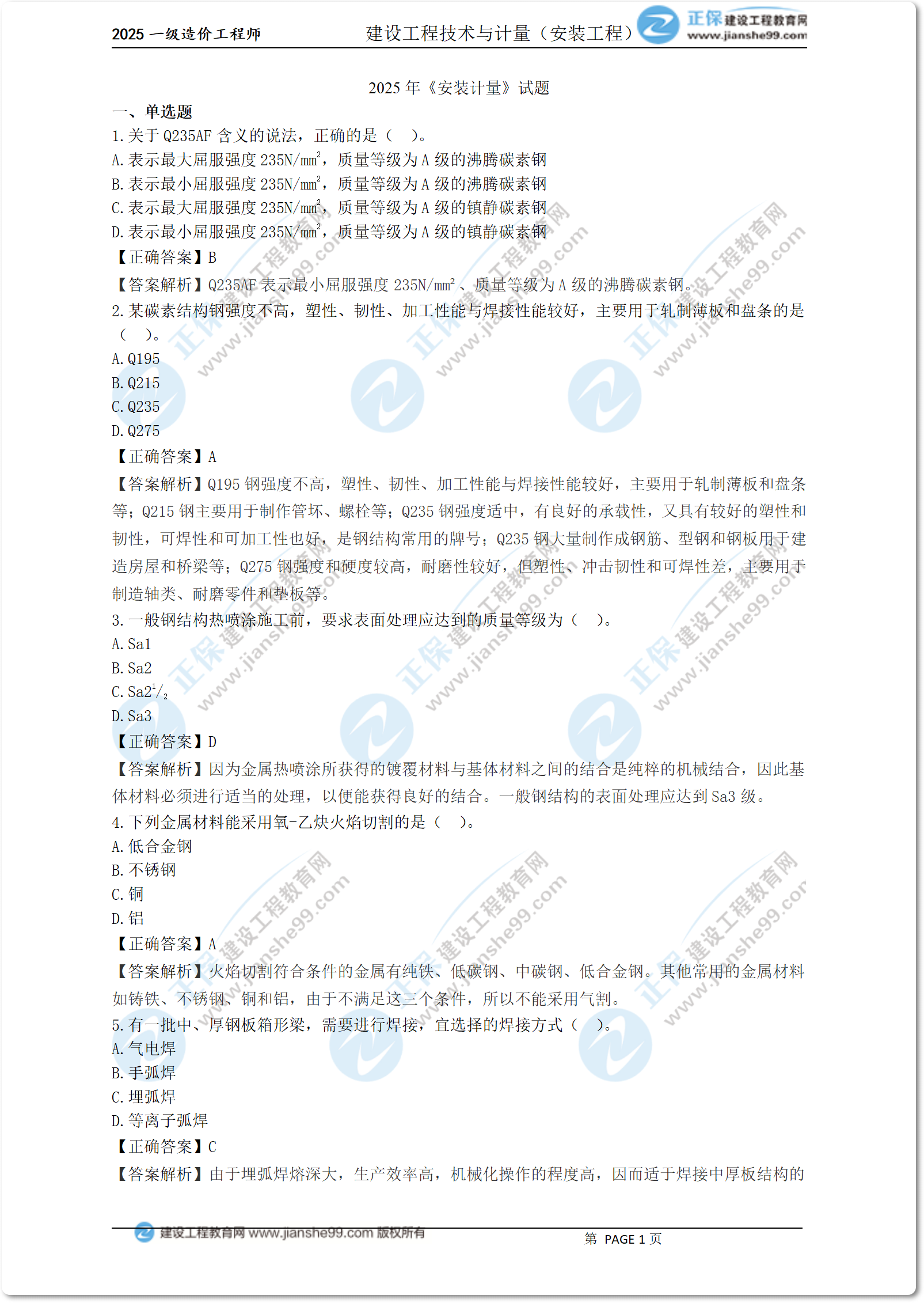 2025年一級造價師考試《安裝計量》科目真題及答案解析