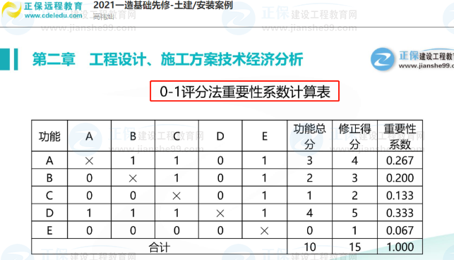 例3第二題,方案優(yōu)先。2021年真題考點包括0-1評分法、綜合評分法、價值工程選優(yōu)、最小費用法。