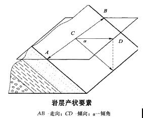 結(jié)構(gòu)面的產(chǎn)狀由走向、傾向和傾角三個(gè)產(chǎn)狀要素,如圖1.1.2所示。層面的產(chǎn)狀還代表所在巖層的產(chǎn)狀,即表示所在巖層的空間位置。