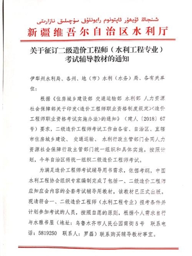 關(guān)于征訂二級(jí)造價(jià)工程師(水利工程專業(yè))考試輔導(dǎo)教材的通知