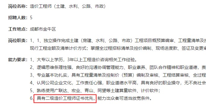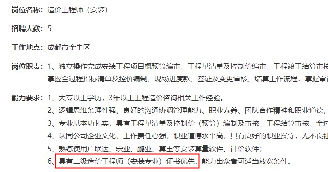 近日,四川某大型工程項(xiàng)目管理公司就公開(kāi)招聘造價(jià)師,有二級(jí)造價(jià)師證書(shū)的優(yōu)先!