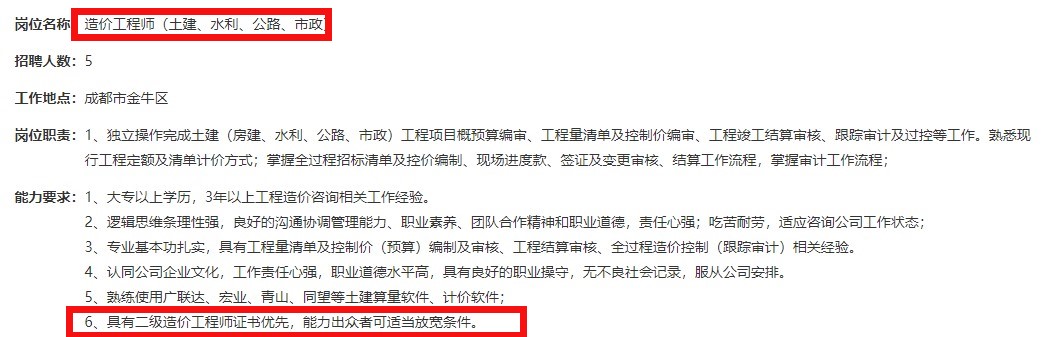 近日四川某大型工程公司招聘多名造價(jià)師,有二造證書就能擔(dān)任,還有五險(xiǎn)雙休,福利多多。