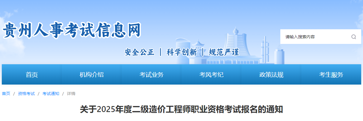 貴州省人事考試信息網(wǎng)發(fā)布關(guān)于2025年度二級(jí)造價(jià)工程師職業(yè)資格考試報(bào)名的通知,詳情如下: