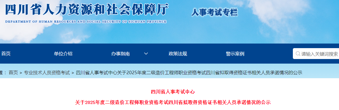四川省人事考試中心關于2025年度二級造價工程師職業(yè)資格考試四川省擬取得資格證書相關人員承諾情況的公示