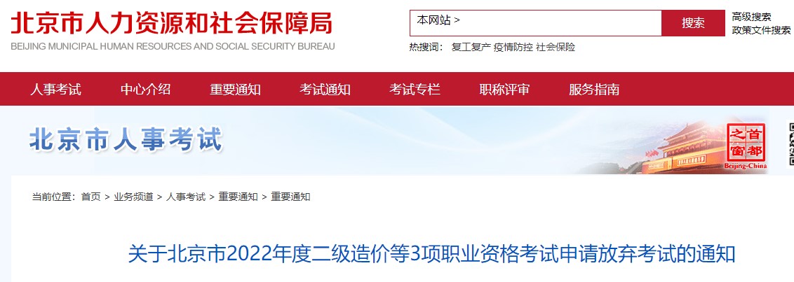 關(guān)于北京市2022年度二級(jí)造價(jià)等3項(xiàng)職業(yè)資格考試申請(qǐng)放棄考試的通知