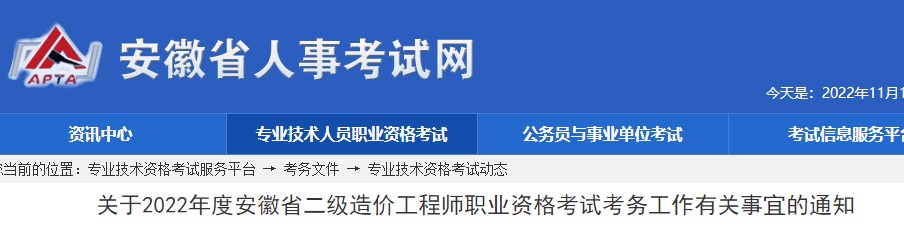 安徽關(guān)于2022年度二級造價工程師職業(yè)資格考試考務工作有關(guān)事宜的通知