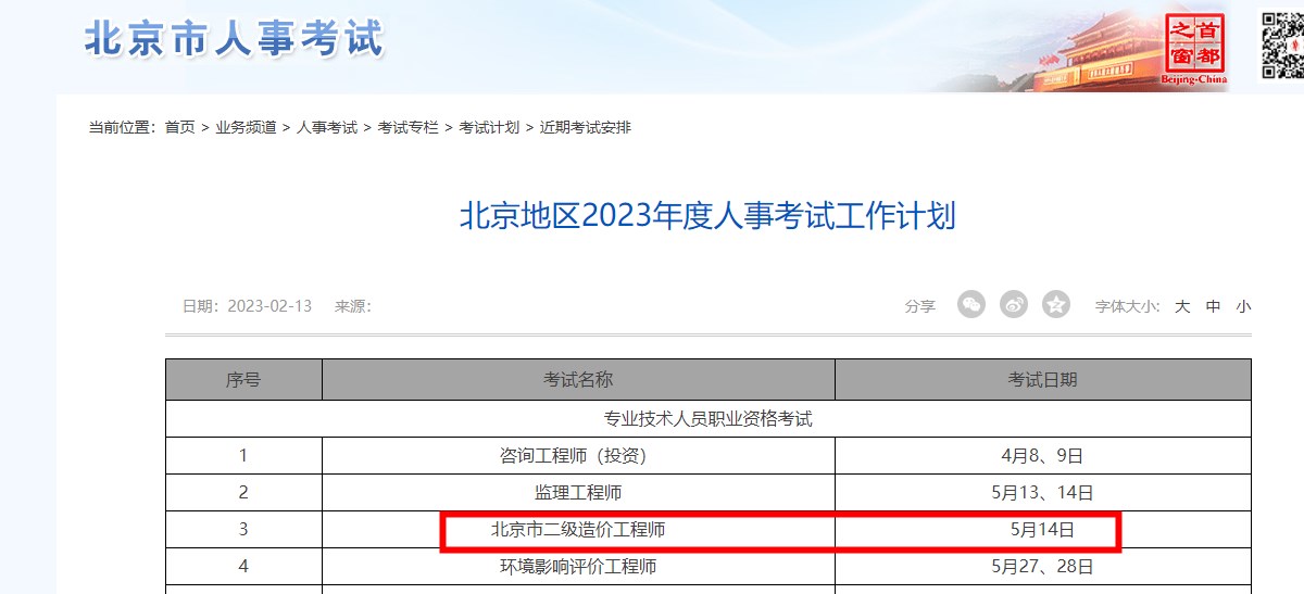 北京市人事考試網(wǎng)發(fā)布2023年度人事考試工作計(jì)劃,其中確定2023年二級(jí)造價(jià)師考試時(shí)間為5月14日。