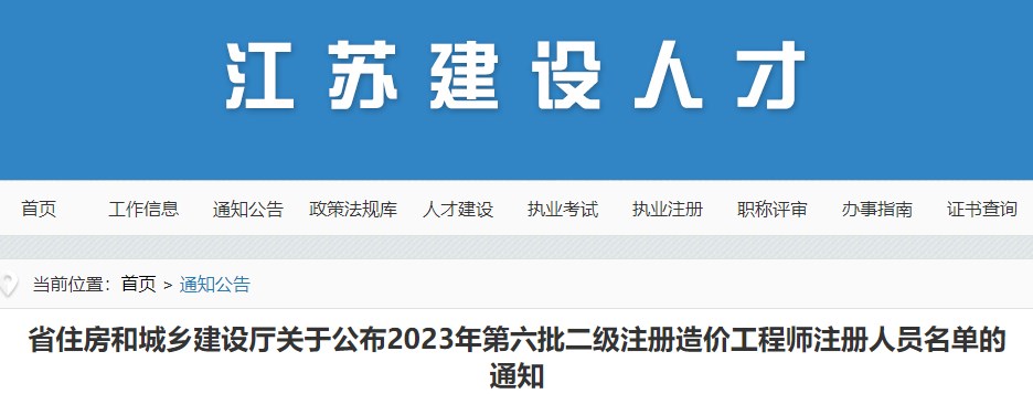 江蘇省關(guān)于公布2023年第六批二級(jí)造價(jià)師注冊(cè)人員名單的通告