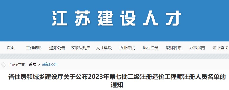 江蘇省關于2023年第七批二級造價師注冊人員名單的通知