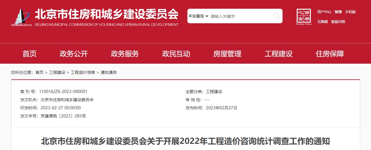 北京市住房和城鄉(xiāng)建設(shè)委員會關(guān)于開展2022年工程造價咨詢統(tǒng)計調(diào)查工作的通知