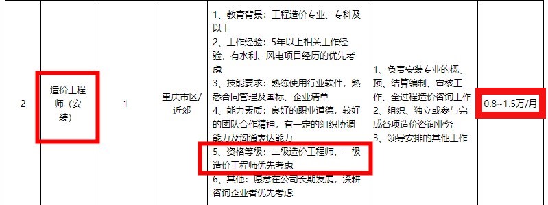 重慶某工程管理有限公司在招聘信息中表明,具有二級造價師證書優(yōu)先,薪酬0.8-1.5w/月。