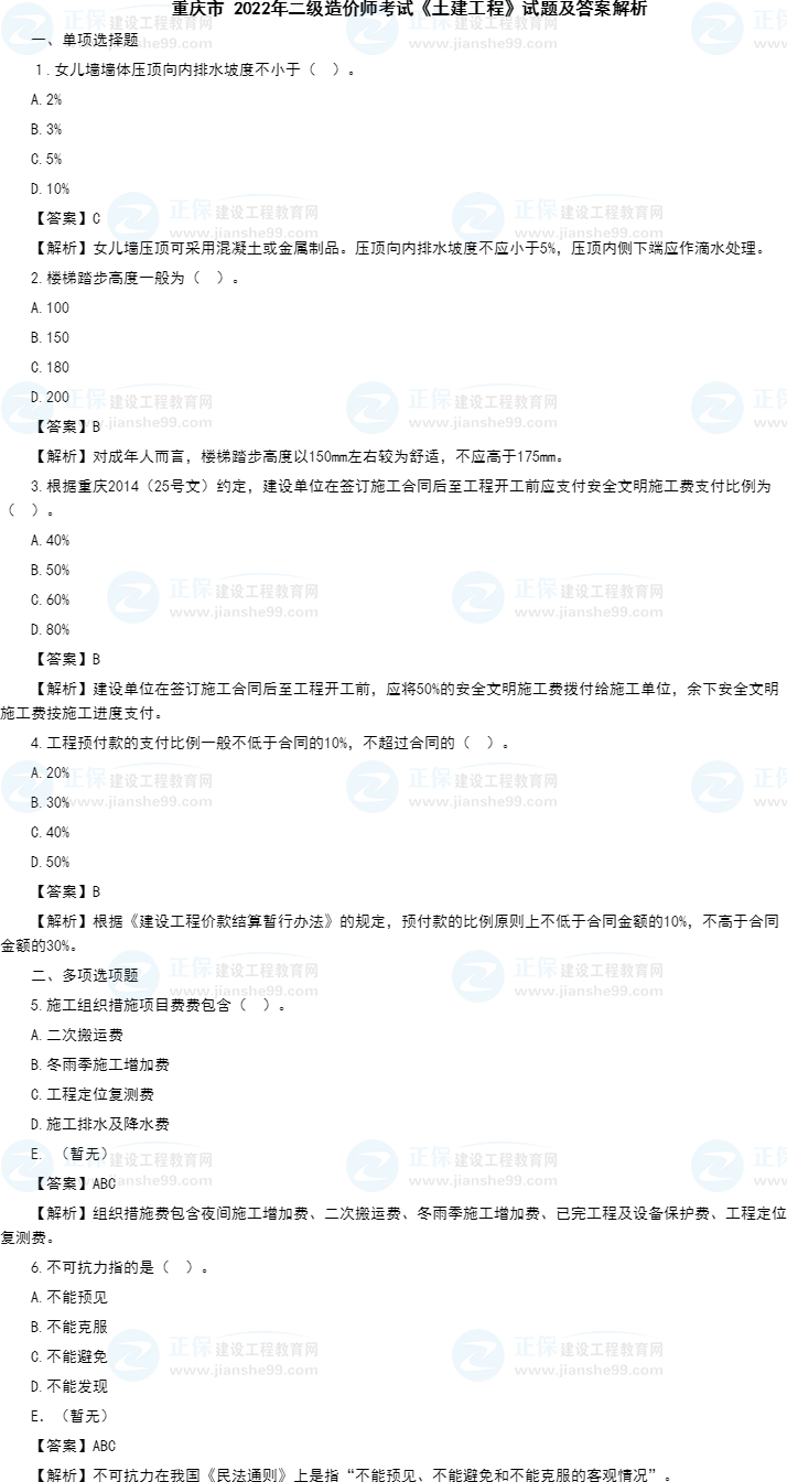 重慶市 2022年二級造價師考試《土建工程》試題及答案解析(部分)
