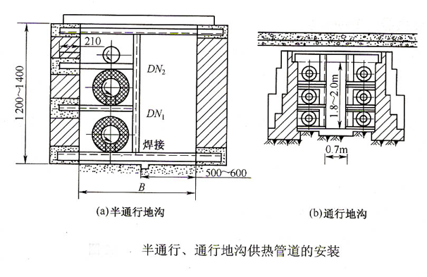 通行地溝敷設(shè) 地溝高度1.8~2.0m,寬度0.7m.地溝內(nèi)應(yīng)有檢修孔、照明、排水和通風(fēng)設(shè)施。
