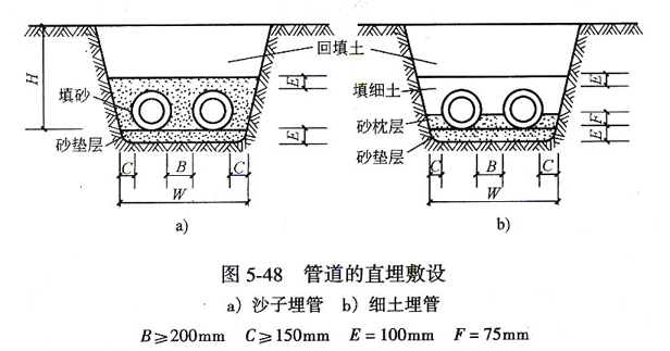 2)埋地敷設(shè)將管道直接埋于地下。比較經(jīng)濟。適用于地下水位較低,土質(zhì)不下沉,土壤不帶腐蝕性切不很潮濕的地區(qū)。