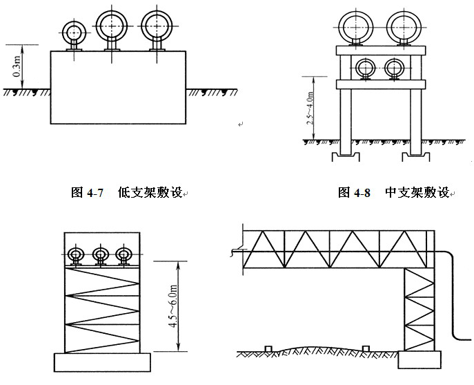 高支架敷設(shè),在跨越公路或鐵路時,可采用高支架敷設(shè),高支架凈空高度為4.5~6.0m。