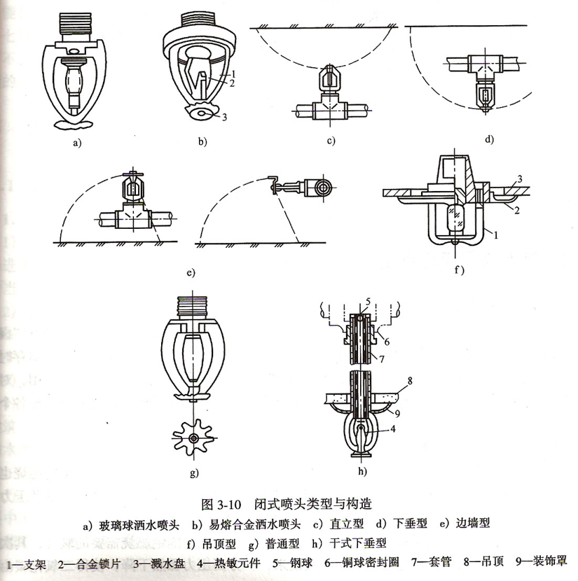 閉式噴頭按其熱敏元件不同,有玻璃球噴頭和易熔元件噴頭。按其濺水盤形式和安裝位置不同有:直立型、下垂型、邊墻型、吊頂型和干式下垂型。
