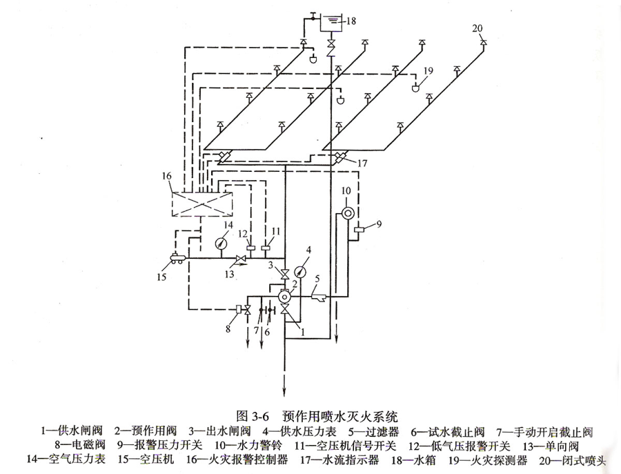 3.預(yù)作用噴水滅火系統(tǒng)預(yù)作用滅火系統(tǒng)包括火災(zāi)探測報(bào)警系統(tǒng)、閉式噴頭、預(yù)作用閥、充氣設(shè)備、管道系統(tǒng)、控制系統(tǒng)、供水設(shè)施等。