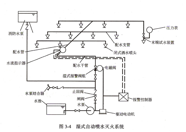 1.濕式噴淋水滅火系統(tǒng)濕式自動(dòng)噴水滅火系統(tǒng)主要由閉式噴頭、管網(wǎng)、報(bào)警閥、水流指示器、消防水池、消防水箱、消防水泵等組成。