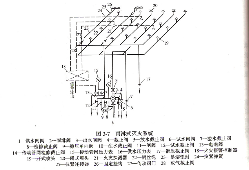 自動(dòng)噴水滅火系統(tǒng)有:濕式自動(dòng)噴水滅火系統(tǒng)、干式自動(dòng)噴水滅火系統(tǒng)、預(yù)作用噴水滅火系統(tǒng)、雨淋系統(tǒng)、水幕系統(tǒng)、水噴霧滅火系統(tǒng)等。