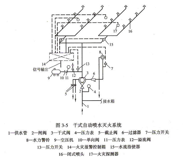 2.干式自動(dòng)噴水滅火系統(tǒng)系統(tǒng)內(nèi)平時(shí)充有壓縮空氣,水不能進(jìn)入配水管網(wǎng),適于布置在室內(nèi)溫度低于O℃或環(huán)境溫度可能超過70°的房間或建筑物內(nèi),其噴頭宜向上設(shè)置。