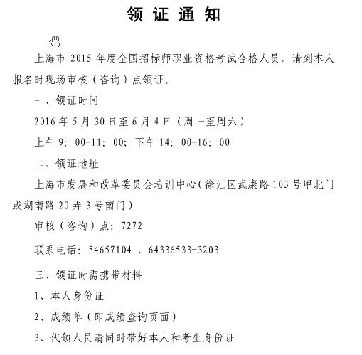 摘要:上海地區(qū)2015年招標(biāo)師合格證已經(jīng)可以領(lǐng)取,領(lǐng)取時間:5月30日-6月4日,領(lǐng)取地點:報名時現(xiàn)場審核點。