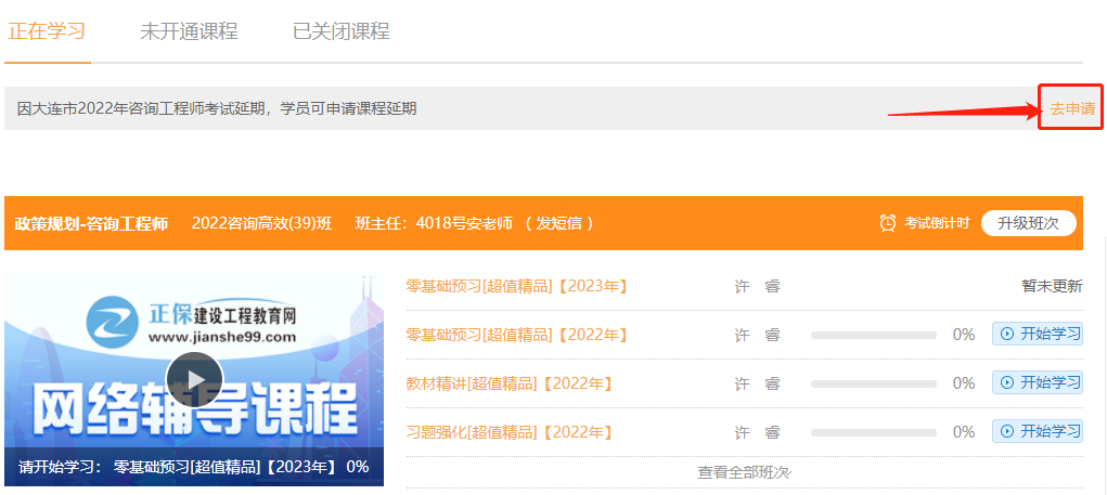 選擇你需要申請的延期課程,點擊“去申請”(尊享無憂班選擇其中一個申請即可)