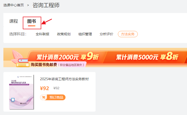 APP端:打開(kāi)“建設(shè)工程教育”APP-選擇“咨詢工程師”(已選擇過(guò)的不需要重復(fù)選擇)-進(jìn)入“商城”-選擇“圖書(shū)”-選擇要購(gòu)買(mǎi)的科目即可。