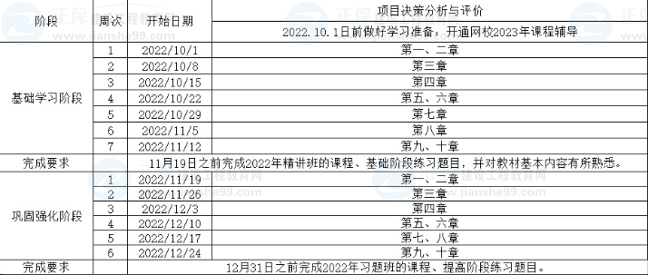1、整體進(jìn)度說明:本計(jì)劃表從2022年10月1日開始執(zhí)行,計(jì)劃于2022年12月31日結(jié)束,共計(jì)13周;其中:基礎(chǔ)學(xué)習(xí)階段安排7周,鞏固強(qiáng)化階段安排6周。學(xué)員可根據(jù)本表的提示,結(jié)合自己的工作,學(xué)習(xí)情況進(jìn)行細(xì)化,并按網(wǎng)校要求完成聽課、做題的學(xué)習(xí)任務(wù),基本可滿足考試需要。