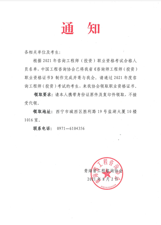 2021年度青海領(lǐng)取咨詢工程師(投資)職業(yè)資格證書的通知