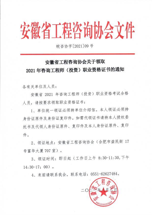 安徽省2021年咨詢工程師證書領(lǐng)取時間是2021年9月6日起。詳情如下: