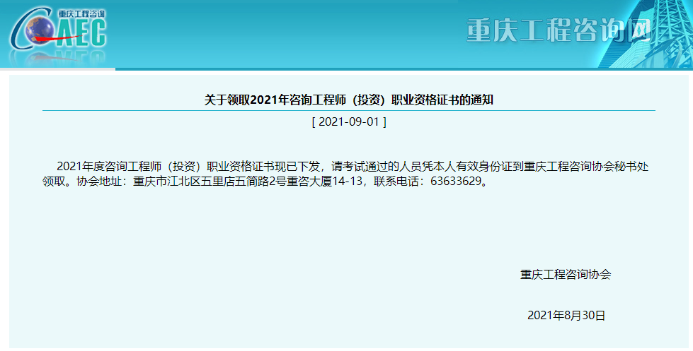 2021年重慶市咨詢工程師合格證書領取時間: